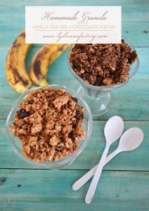 And of course we had to have two versions of this amazing recipe, with our favorites, who can argue with one's taste, right? :) So I made homemade granola with vanilla for me and homemade granola with chocolate for Mr Dreamy!:) Because we are not fans of adding too much sweetness into our food, this recipe is not extremely sweet and can be easily served with your favorite fruits, yogurt and your choice of milk, can be enjoyed as snacks and can be stored in airtight containers for up to two weeks (if only it would last that long!). And is homemade so you get to control all the ingredients which is a big plus these days!
